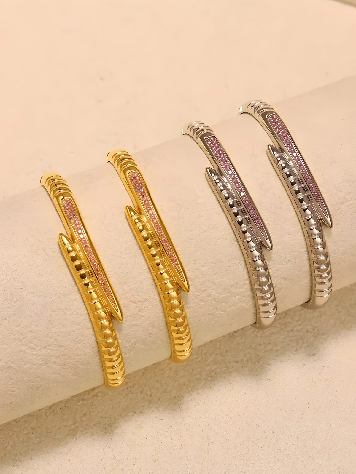 Elevate your style with this Snake Tails shaped stainless steel bracelet, expertly crafted for women who appreciate luxury. Featuring an 18k gold plating and adorned with sparkling zircon stones, this bangle combines durability with refined elegance. Its unique design adds a sophisticated edge to any outfit, making it a timeless accessory for both everyday wear and special occasions.