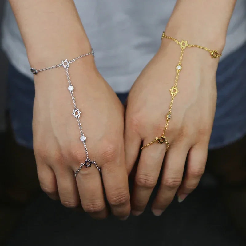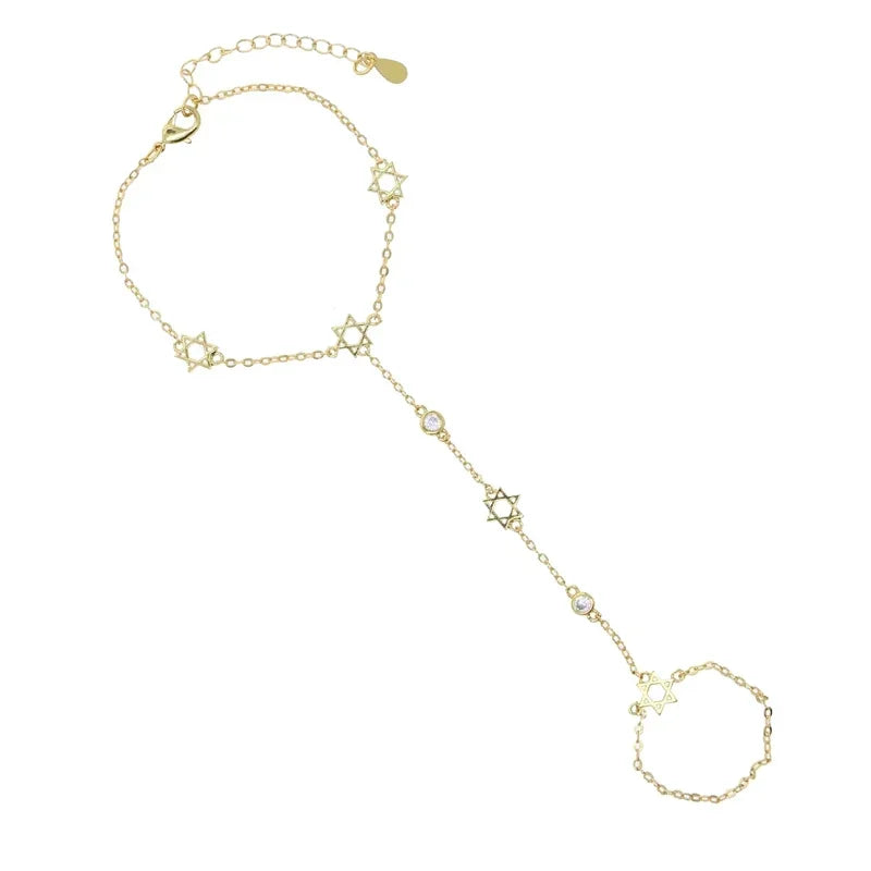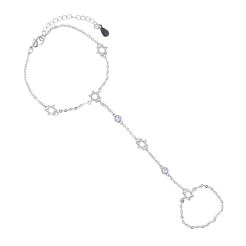 A refined hand chain bracelet featuring sparkling cubic zirconia star charms, crafted with high-quality materials that offer luxury look at an affordable price. The delicate chain ensures comfortable all-day wear, while the modern star design adds stylish flair to any outfit. Perfect for personal wear or wholesale, this piece delivers professional craftsmanship without compromise.
