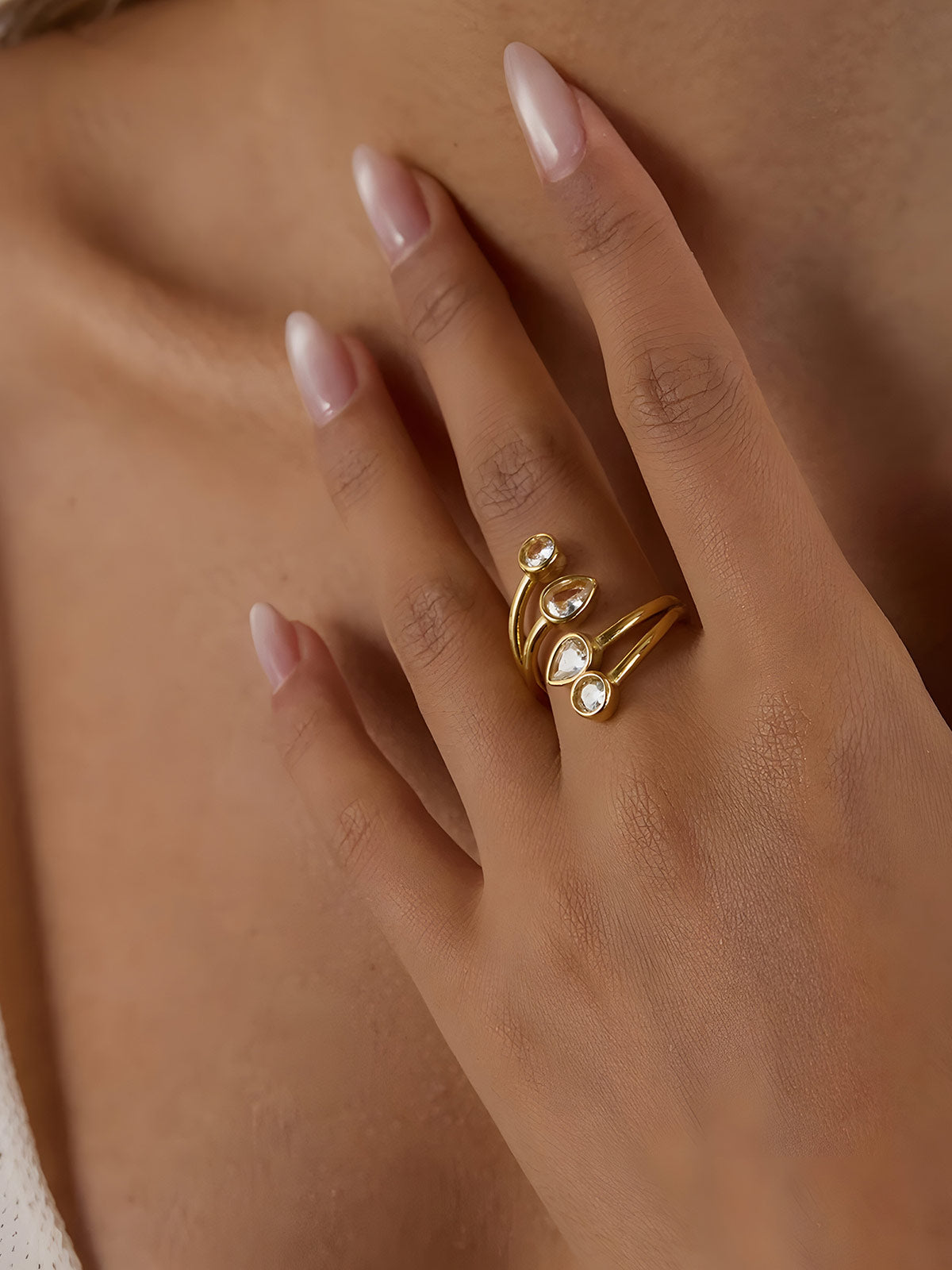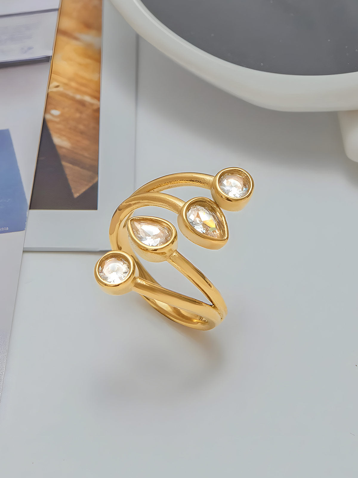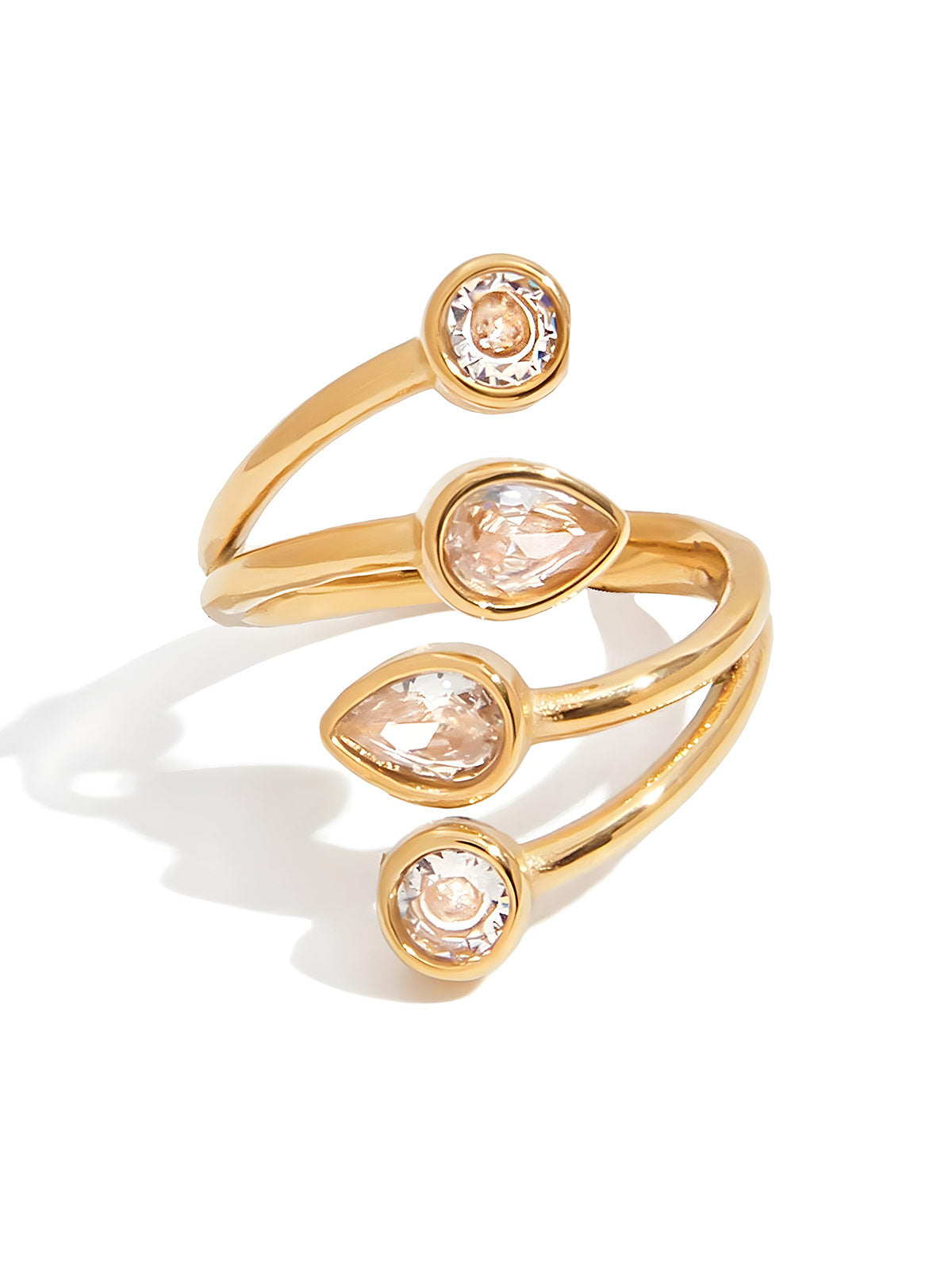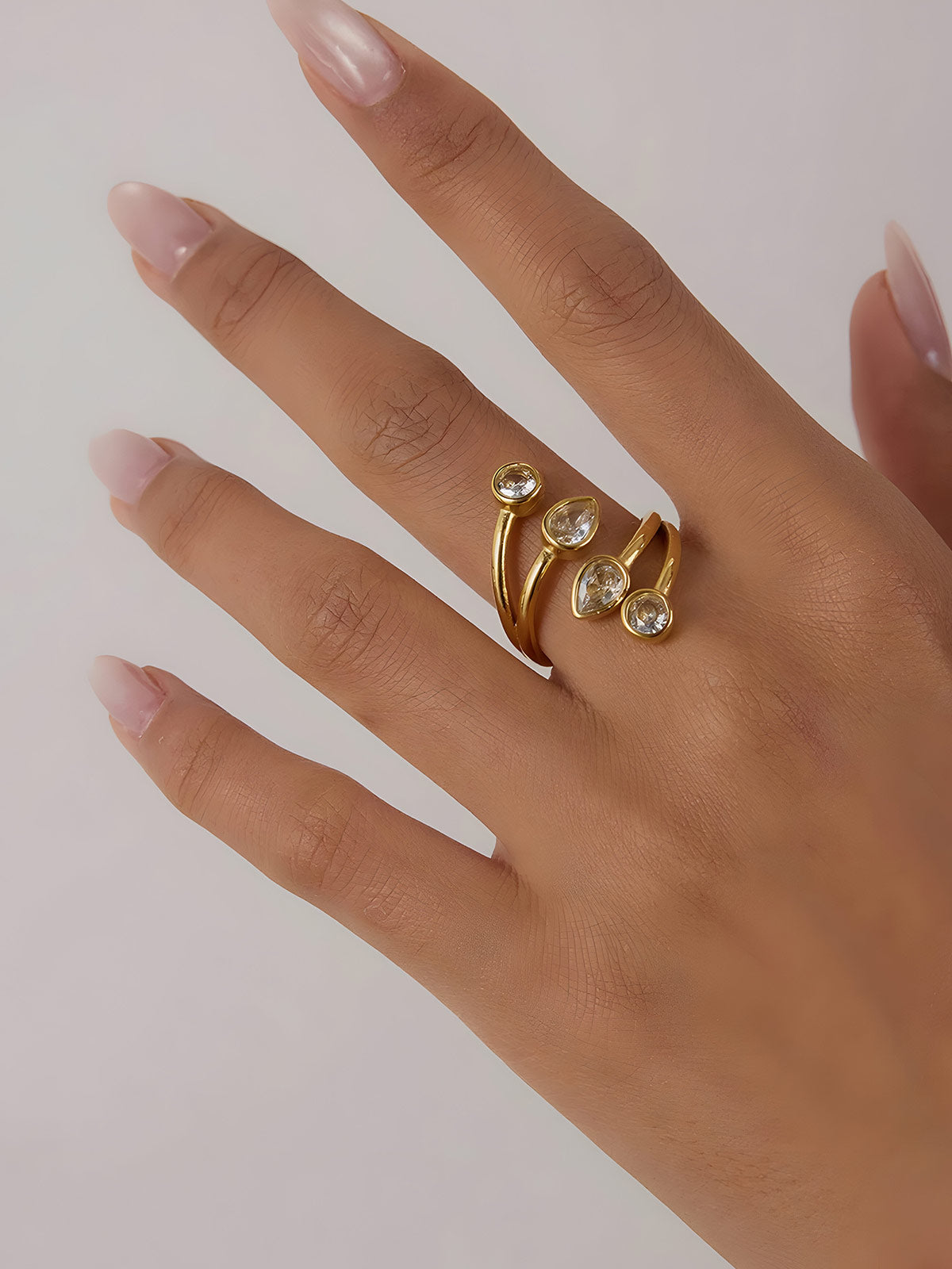 Elevate your jewelry collection with the Youthway White Zirconia Drop Multi-Layer Open Rings. Crafted from durable stainless steel and plated with 18K gold, these rings offer lasting shine and resistance to water. The intricate multi-layer design, accented with sparkling white zirconia drops, adds a sophisticated touch to any outfit. Perfect for wholesale buyers seeking stylish, high-quality finger jewelry that combines elegance with durability.