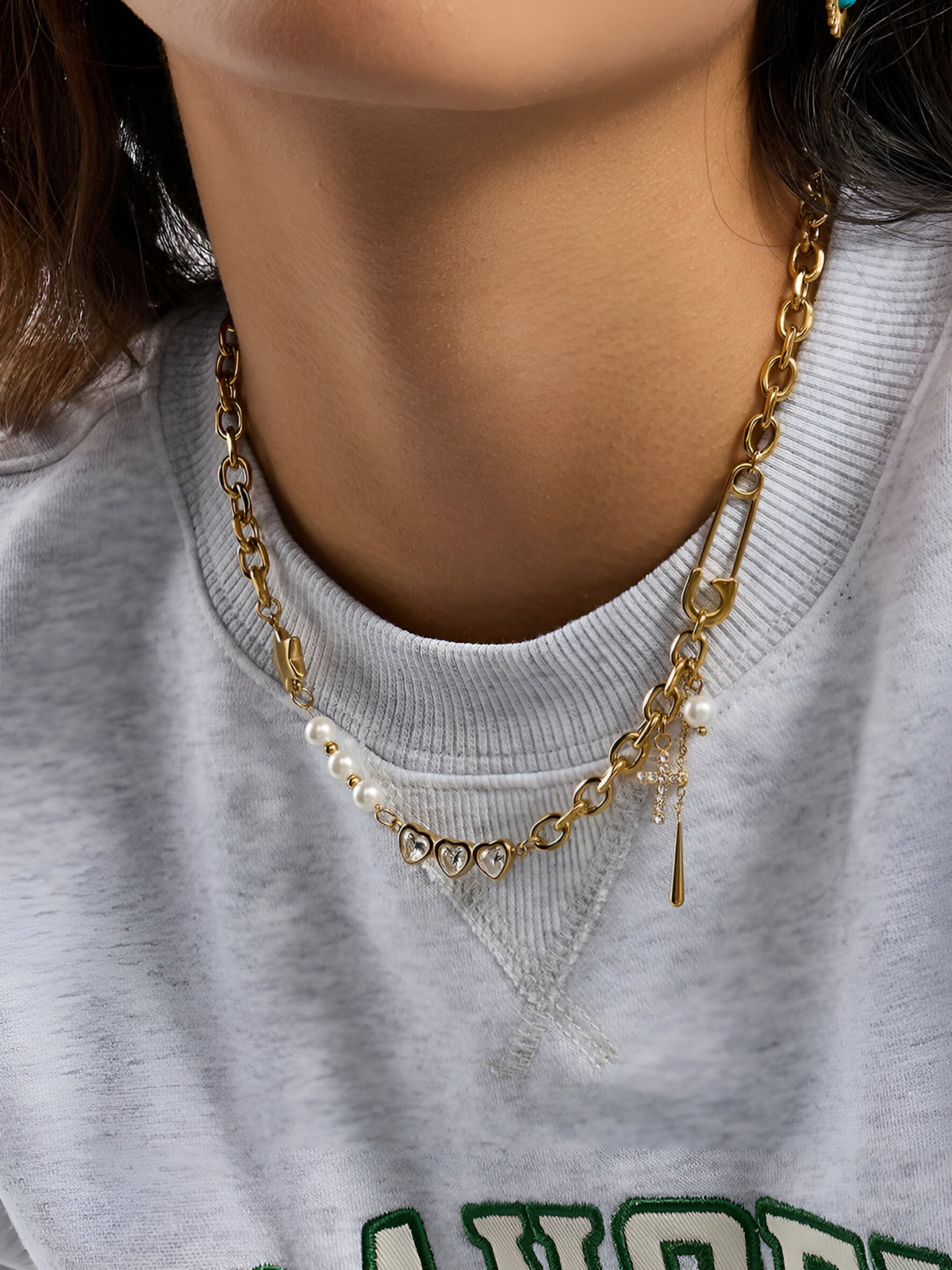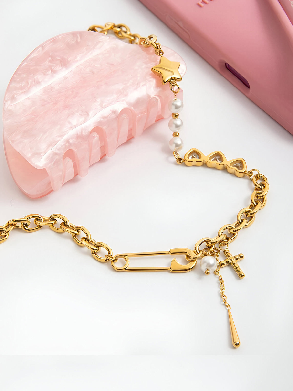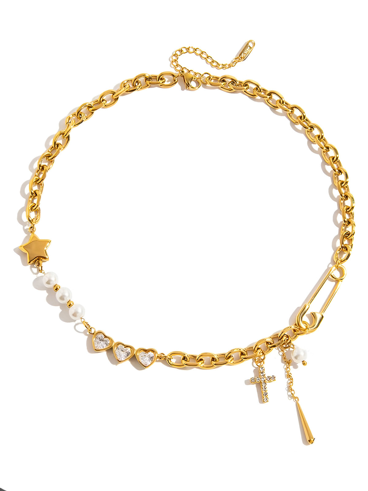 Dual-pendant stainless steel necklace combining a Y2K patchwork paperclip chain with a glossy pentagram cross pendant featuring cubic zirconia. Durable, tarnish-resistant, and versatile for layering or solo wear.