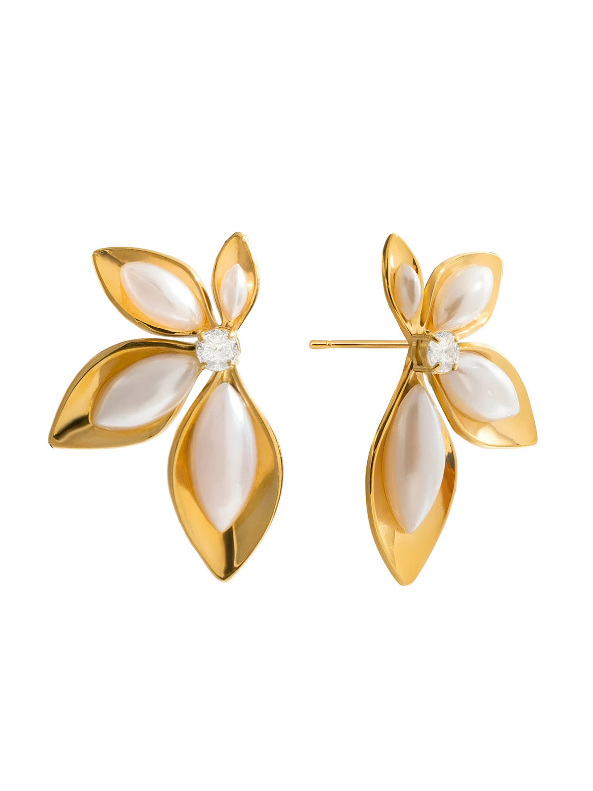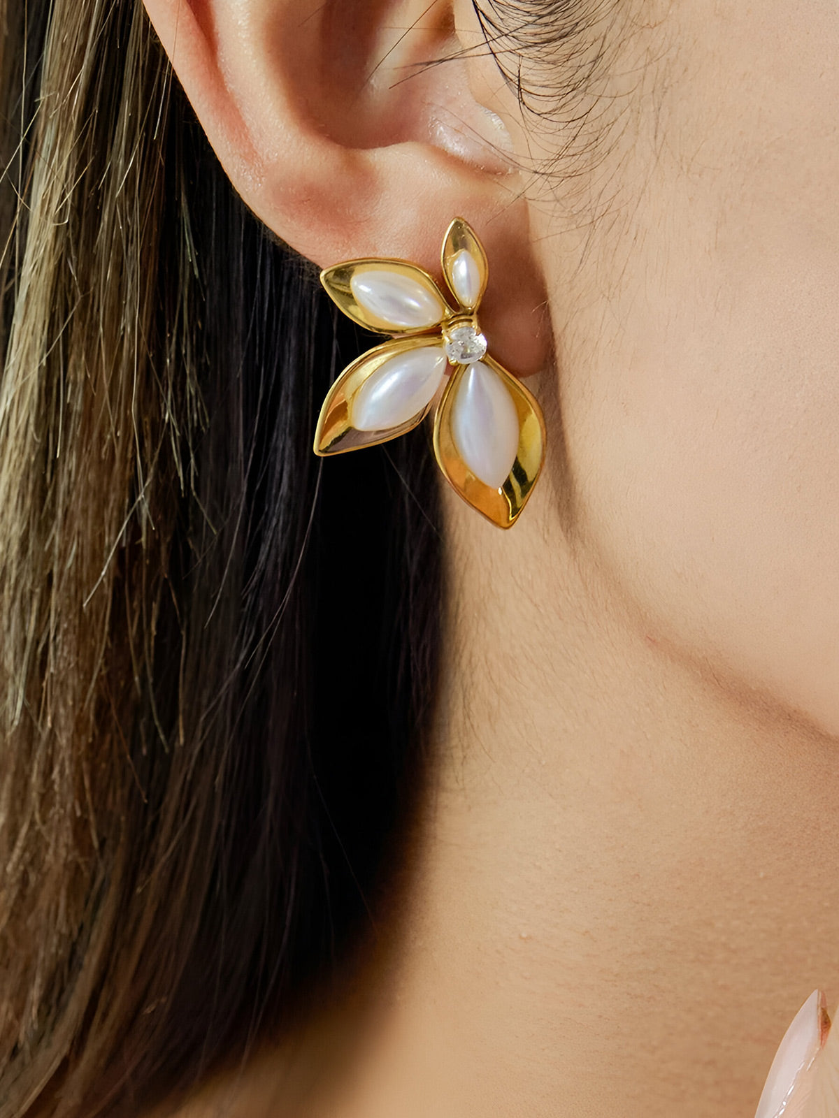 These maple-shaped earrings blend elegance with practicality. Crafted from hypoallergenic stainless steel with 18K gold plating, they feature white zircon and resin pearl details. Ideal for sensitive skin and versatile enough for any occasion, they deliver refined style with lasting quality.