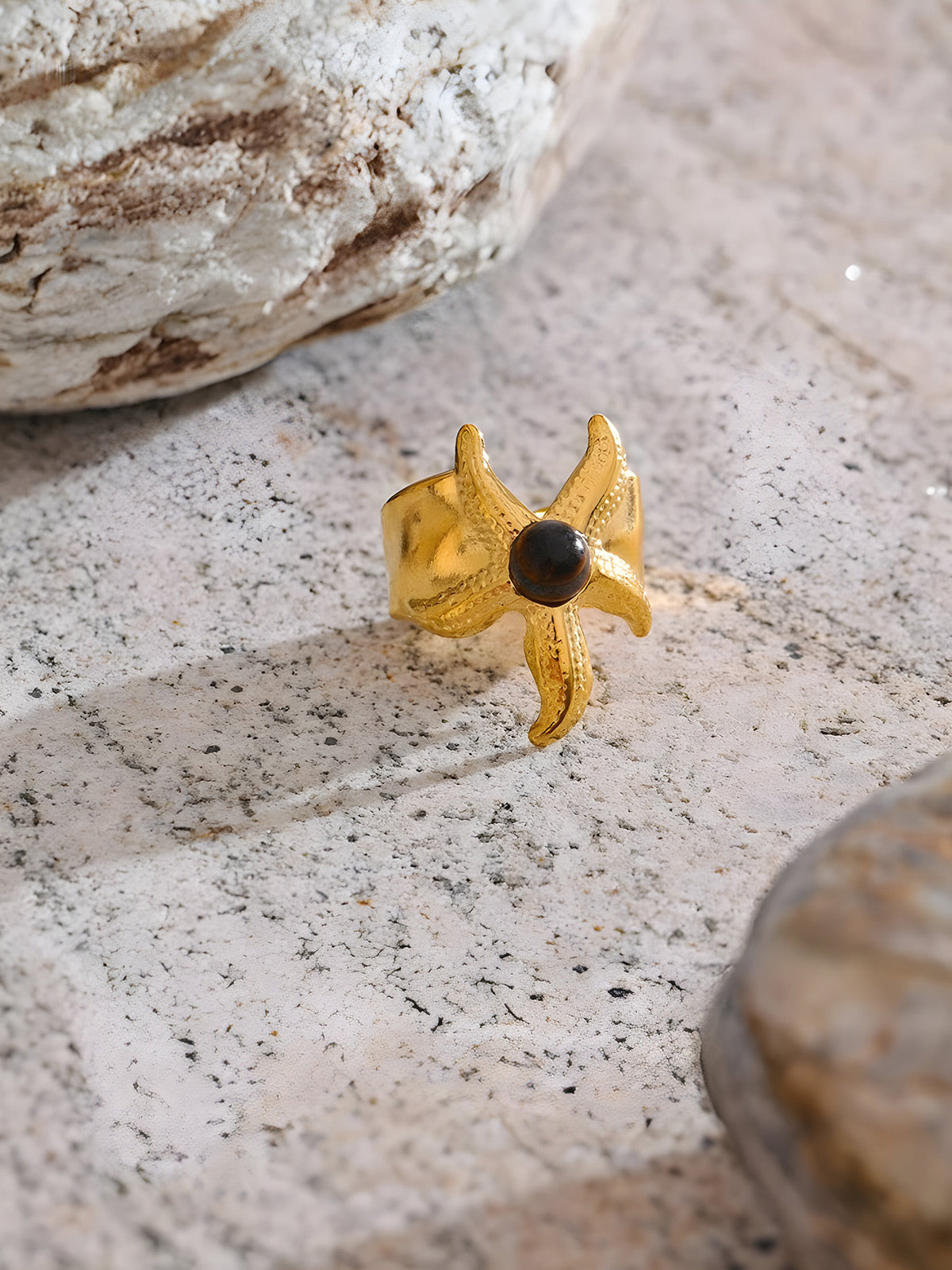 This open ring features a stainless steel band adorned with a natural tiger stone and a starfish design, embodying a stylish ocean-inspired theme. Sized at 7, it offers a comfortable fit perfect for summer beachwear. Durable and corrosion-resistant, this piece combines elegance with resilience, making it an ideal accessory for holiday occasions or a thoughtful gift for those who appreciate marine motifs.