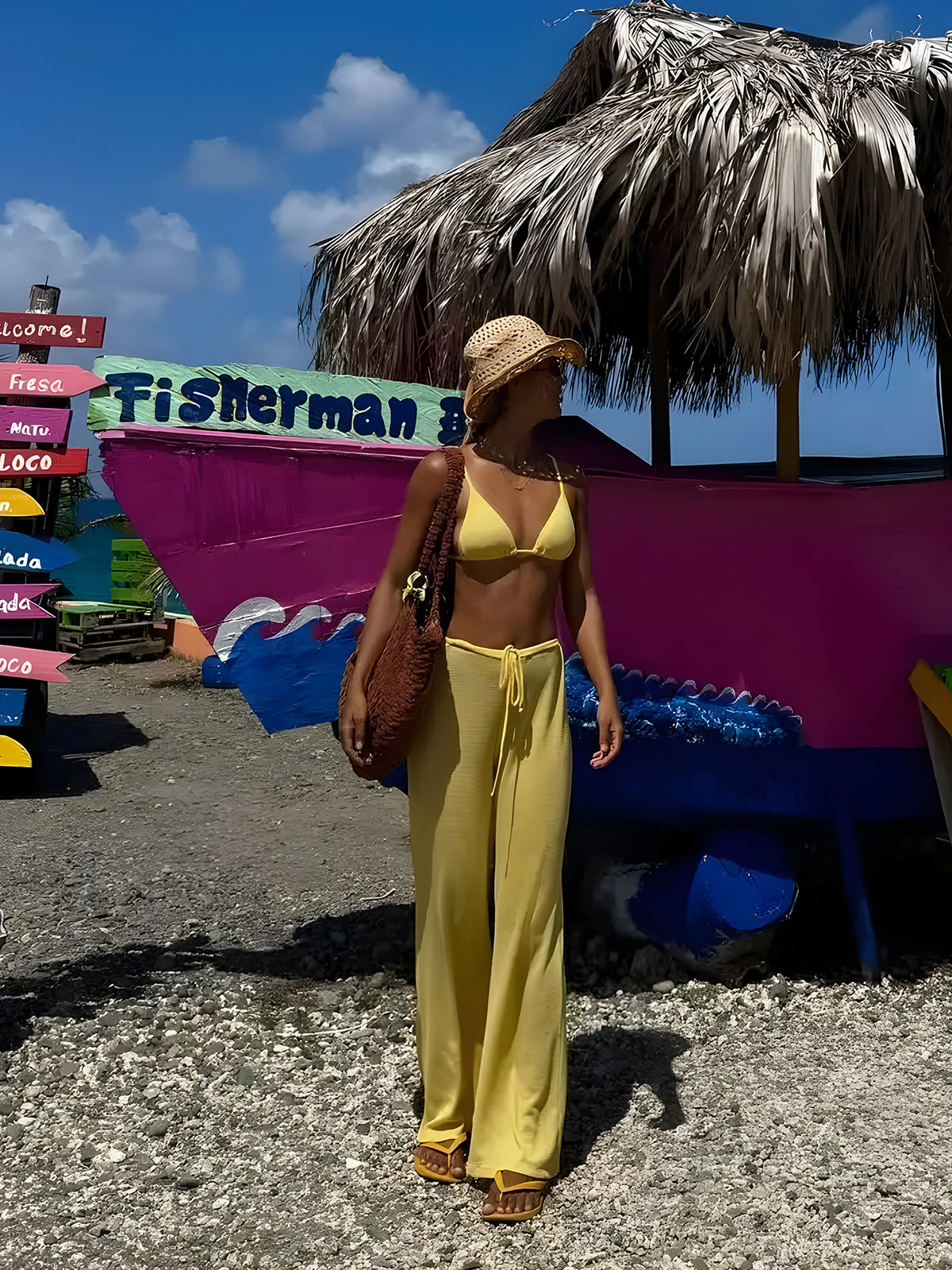 Elevate your beach style with this three-piece bikini set featuring a solid color design. The set includes a knitted mesh cover-up with hollow-out details and matching pants, combining comfort and breathability. Perfect for those seeking a sexy yet sophisticated look, this versatile beachwear offers both coverage and allure, making it ideal for lounging or seaside strolls. Crafted to enhance your silhouette while providing lightweight comfort, it’s a must-have addition to your summer wardrobe.