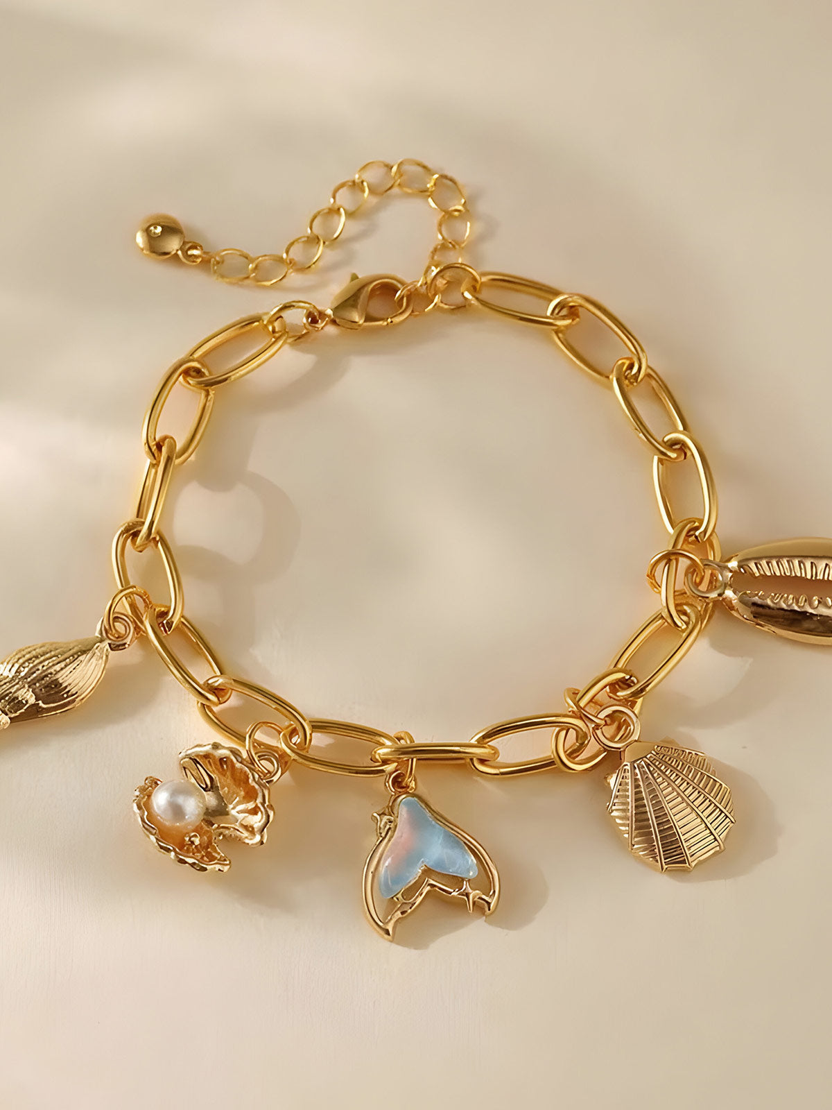 Elevate your accessory collection with this elegant gold-tone starfish and shell chain bracelet. Crafted from durable stainless steel, it features a delicate flower pendant that adds a refined touch. Designed for women who appreciate subtle yet distinctive jewelry, this bracelet offers lasting shine and resistance to tarnish. Perfect as a thoughtful gift or a stylish everyday piece, it combines marine-inspired charm with expert craftsmanship.