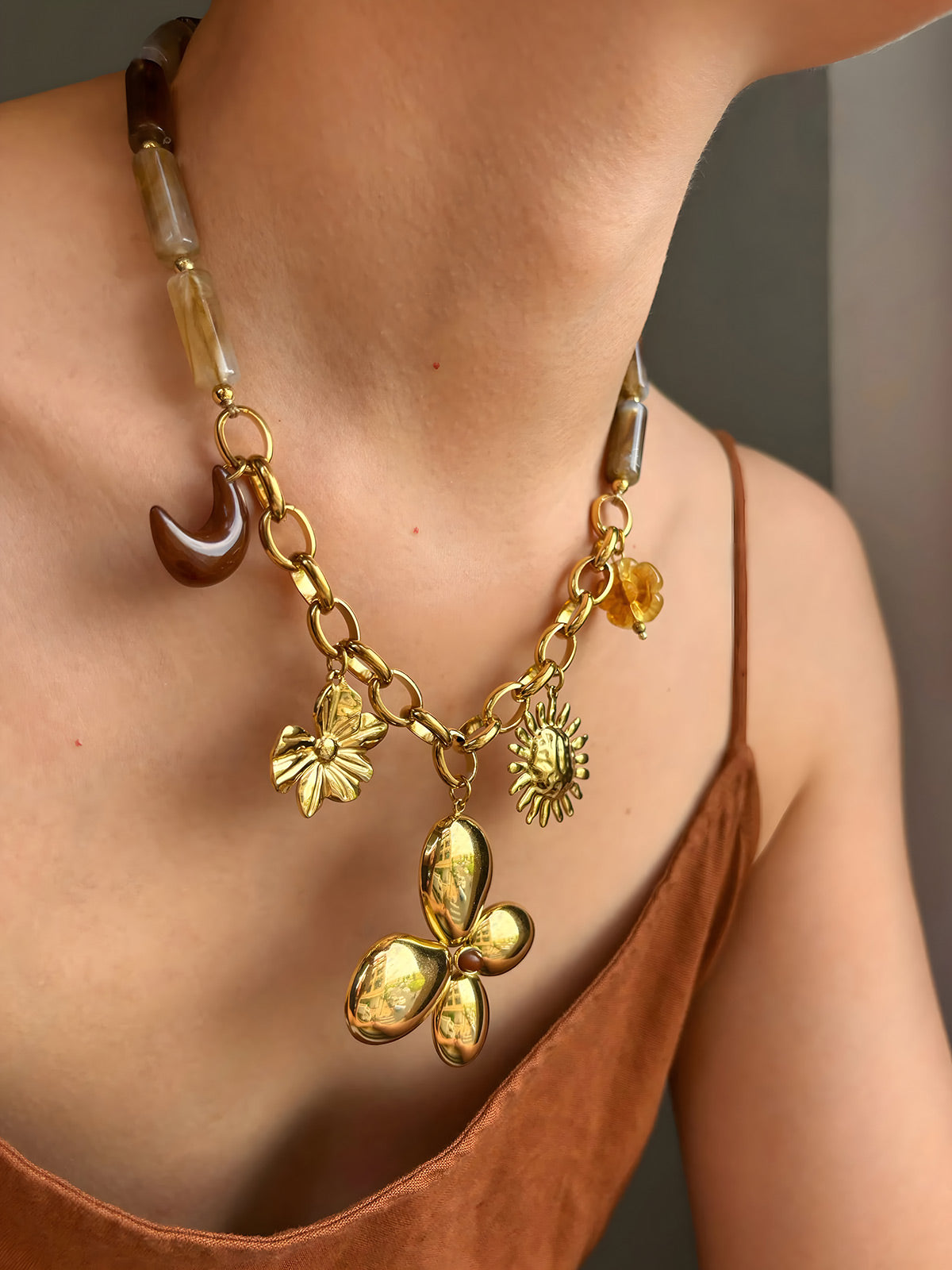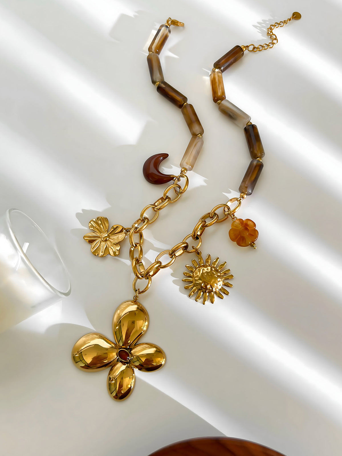 This vintage-style pendant necklace features a celestial sun and moon design with floral accents in resin. Made from gold-plated stainless steel, it's durable and elegant for any occasion. A thoughtful gift for jewelry lovers.