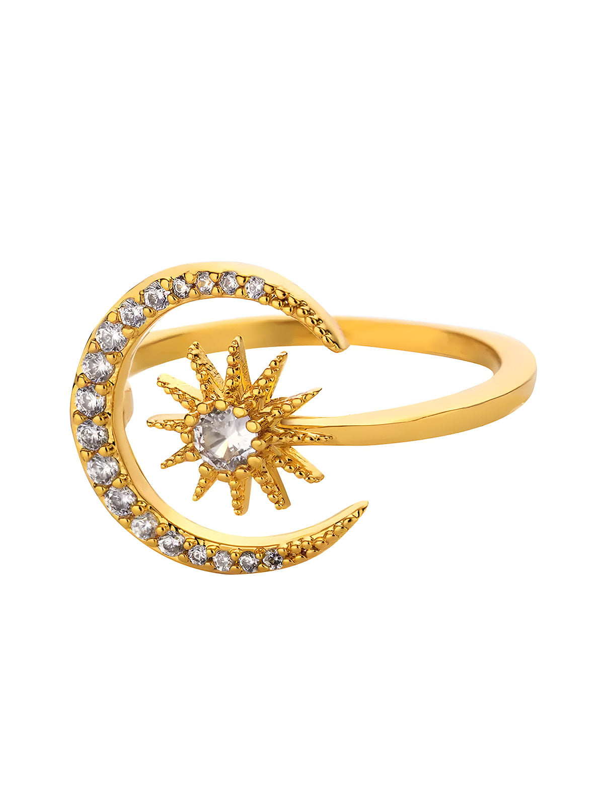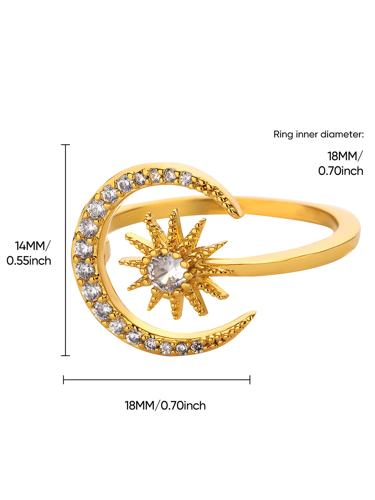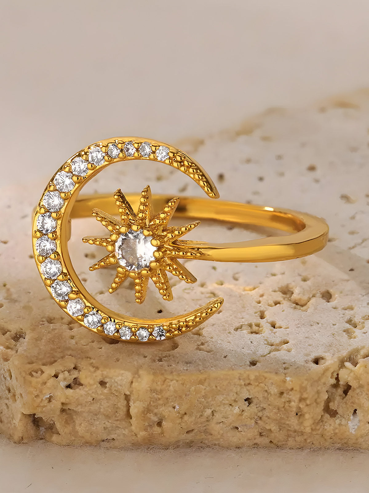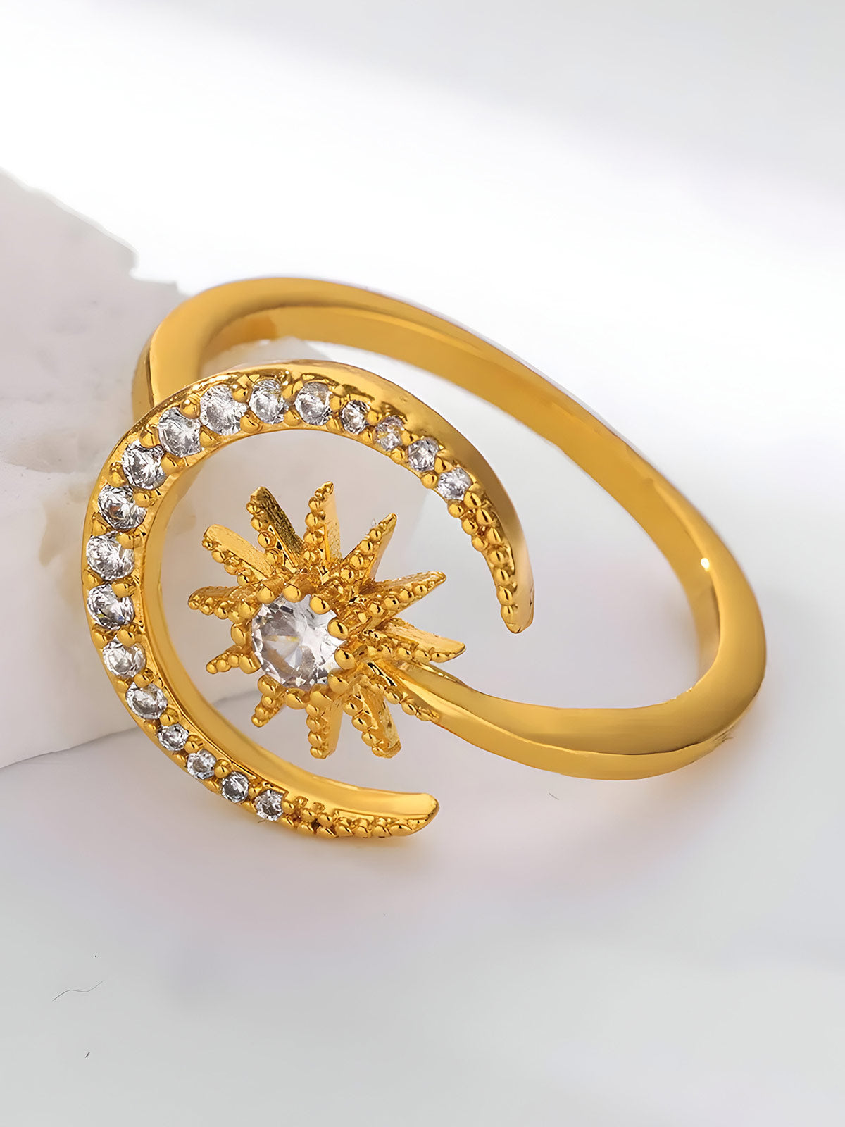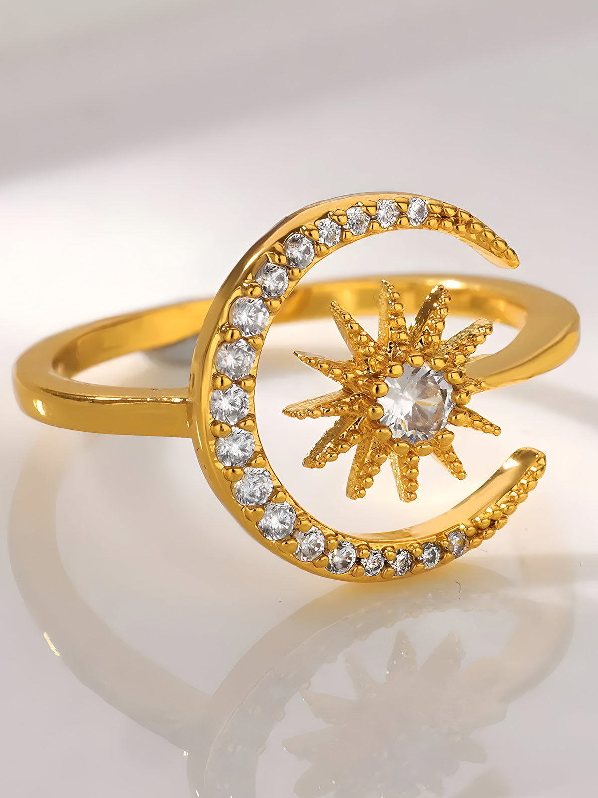 This elegant ring features a delicate crescent moon and star design adorned with sparkling zircon stones, crafted from durable stainless steel with a gold finish. Its geometric aesthetic makes it a refined choice for weddings or everyday wear, combining timeless symbolism with modern style for a sophisticated accessory.