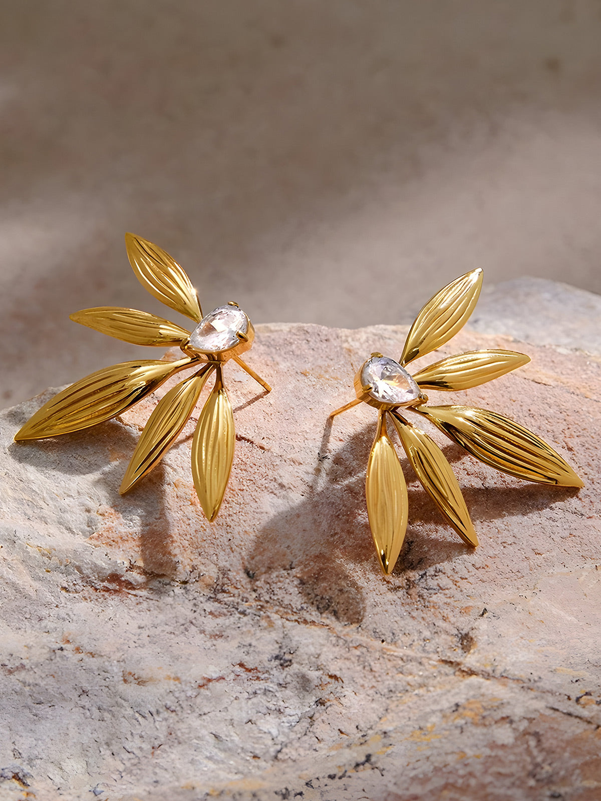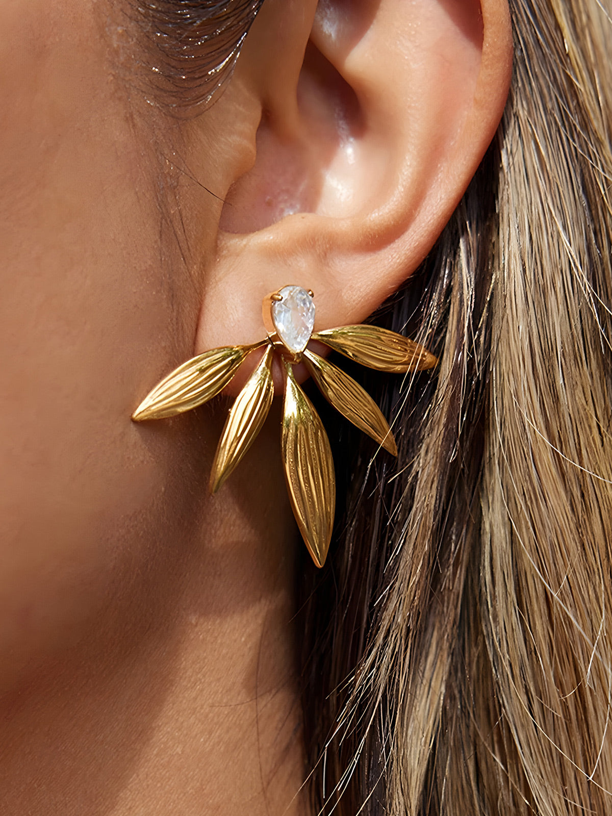 Minimalist gold-tone stainless steel ear studs featuring water droplet and leaf designs with zircon accents. Hypoallergenic and durable, perfect for everyday wear and special occasions alike.