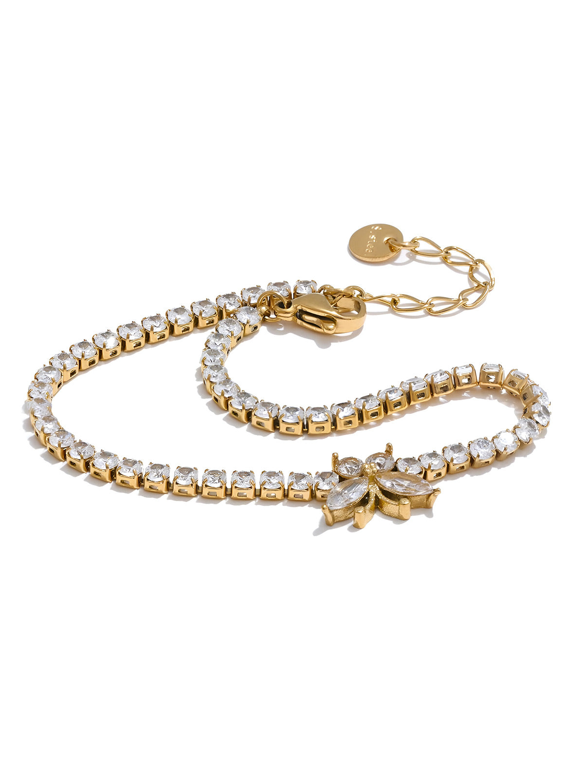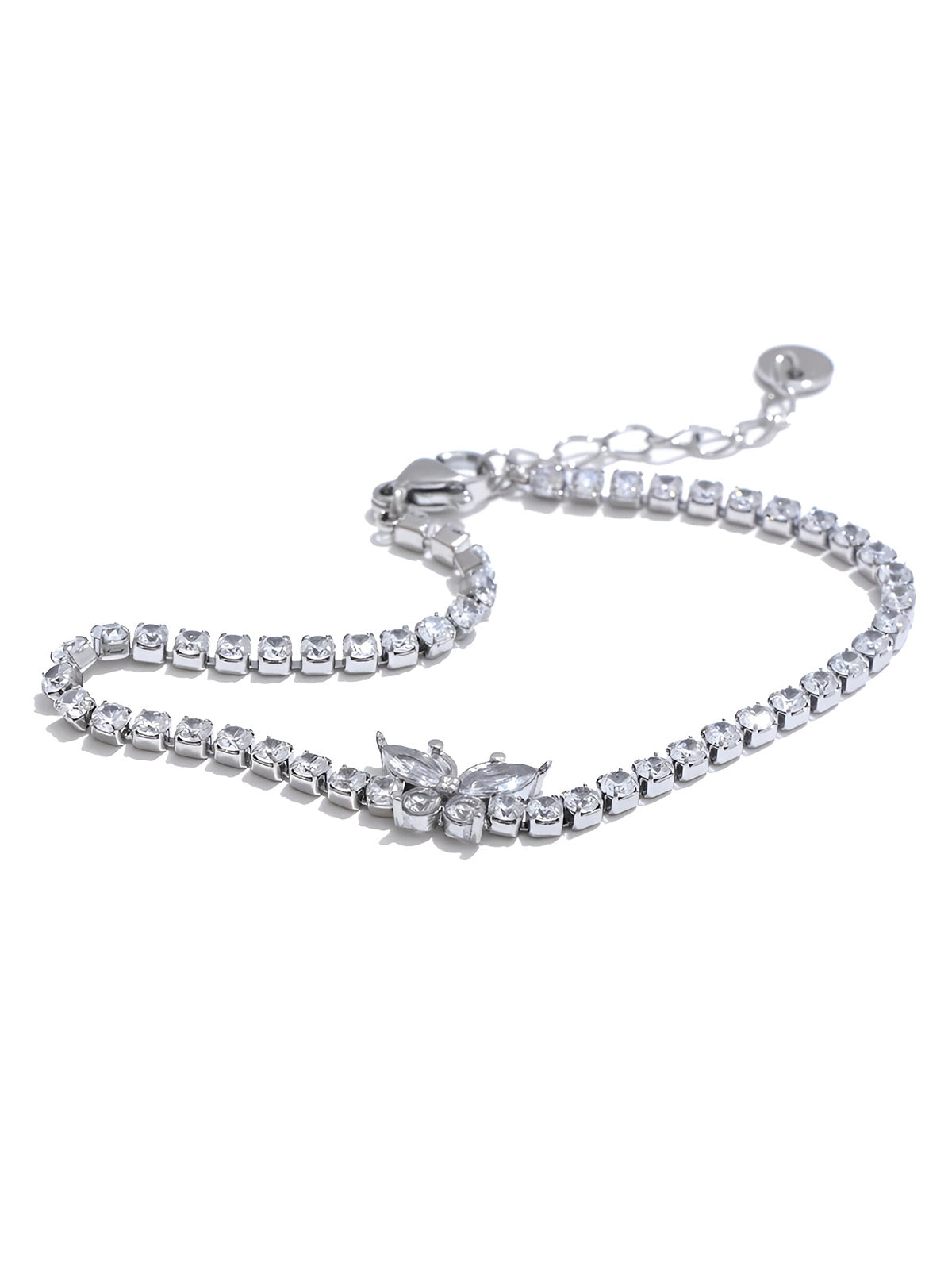 Stunning butterfly bracelet featuring cubic zirconia stones set in durable stainless steel. Available in gold or silver, this delicate bangle resists tarnishing and works for any occasion. Timeless elegance at an accessible price.