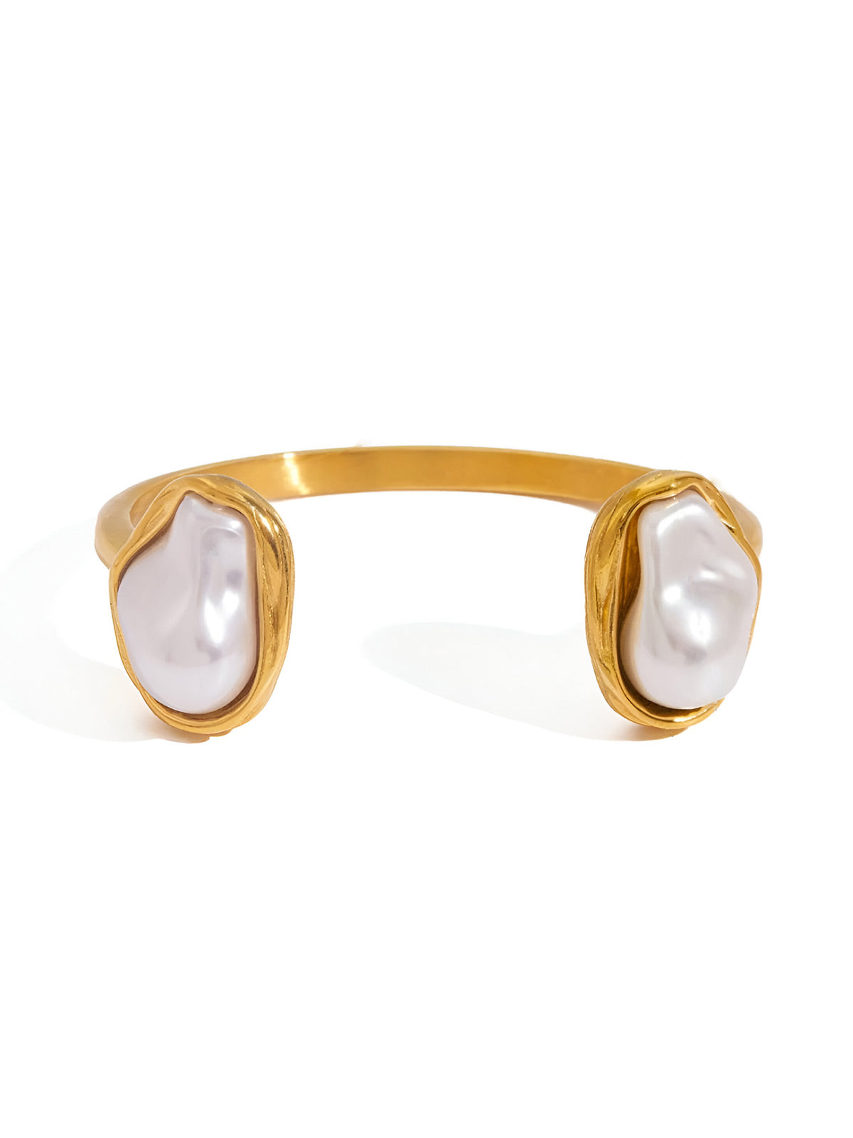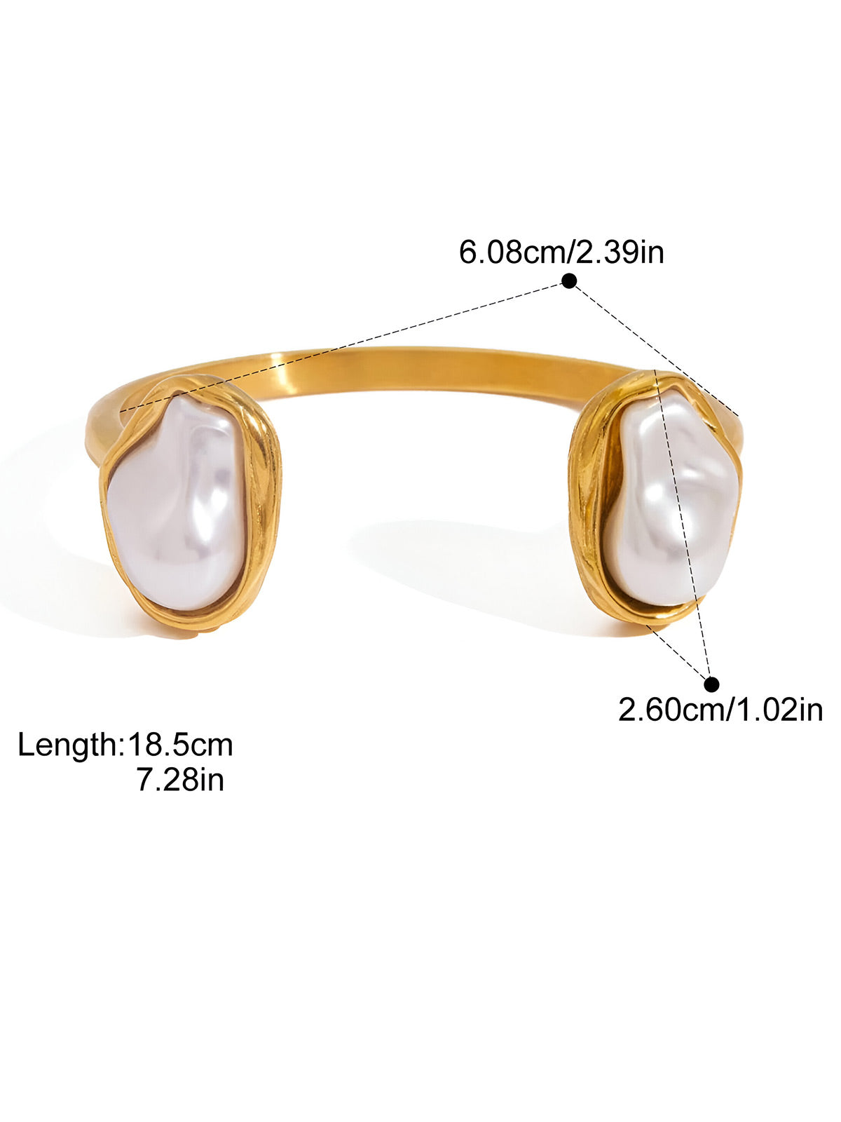 This vintage-inspired bracelet features 18K gold-tone plated stainless steel with irregular resin pearl accents. The unique open design offers adjustable comfort and visual appeal, making it versatile for any occasion. Durable and timeless, it's an essential addition to your jewelry collection.