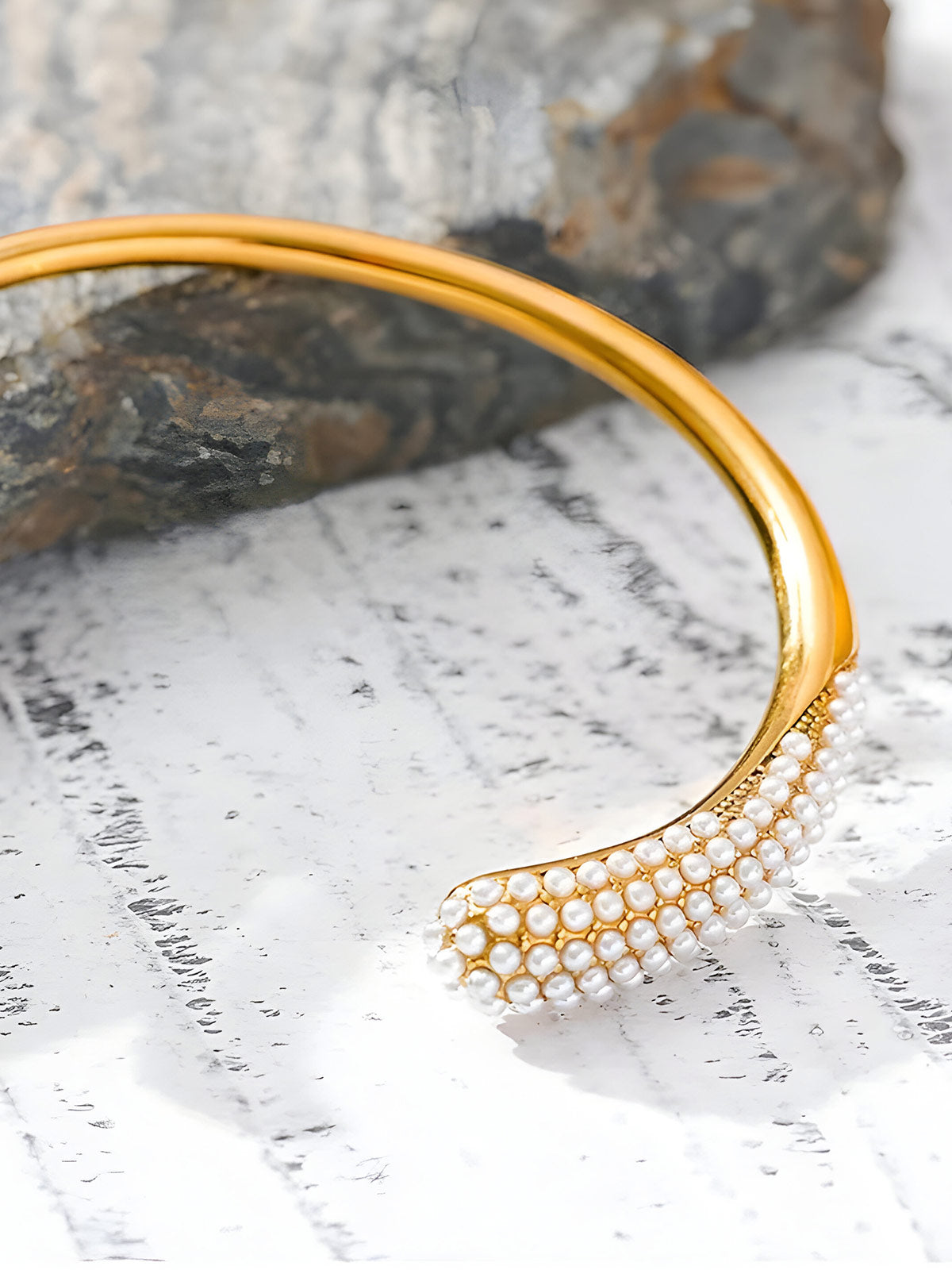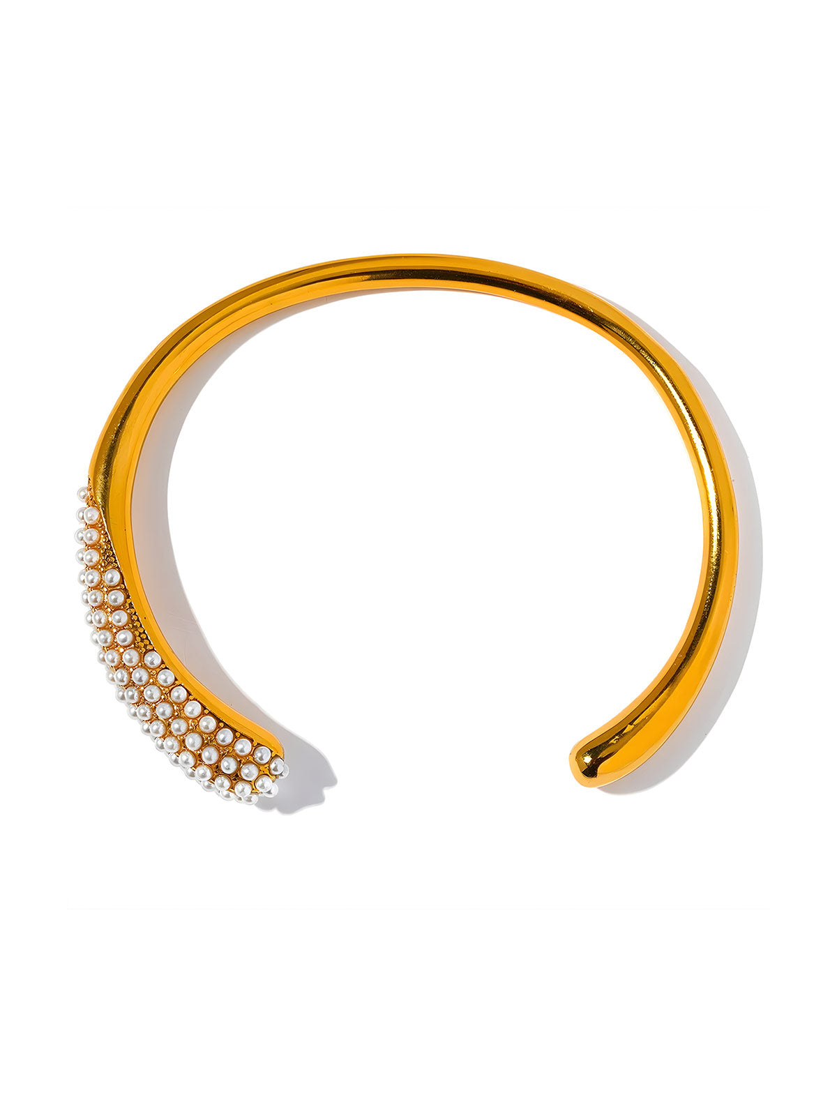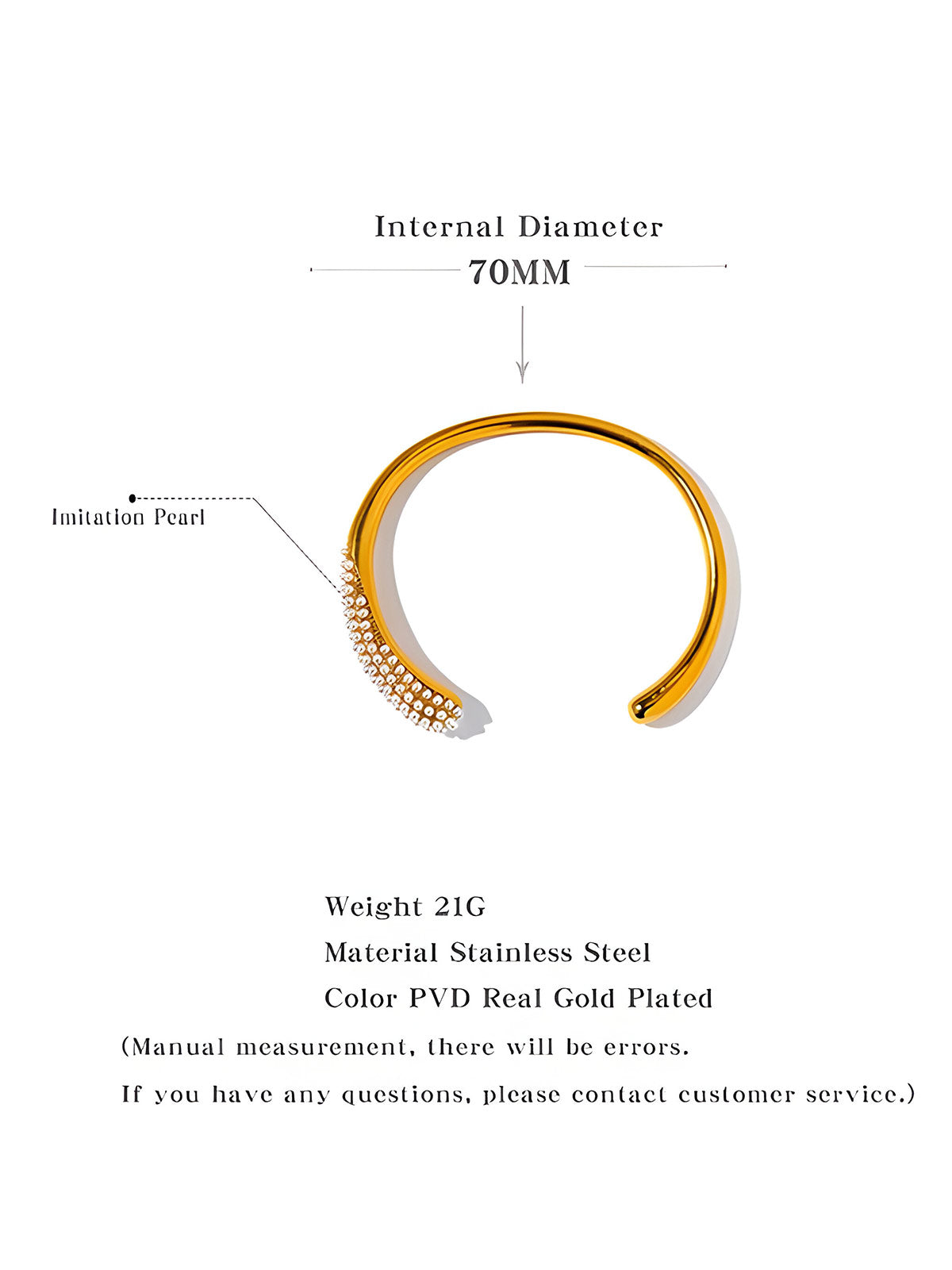 This elegant cuff bracelet combines the timeless appeal of imitation pearls with a modern geometric design crafted from stainless steel. Finished in 18K gold color, it offers durability alongside a luxurious look. Its personalized textured surface adds a unique touch, making it an ideal gift for those who appreciate refined, expert craftsmanship in jewelry. Perfect for elevating any outfit with subtle sophistication.