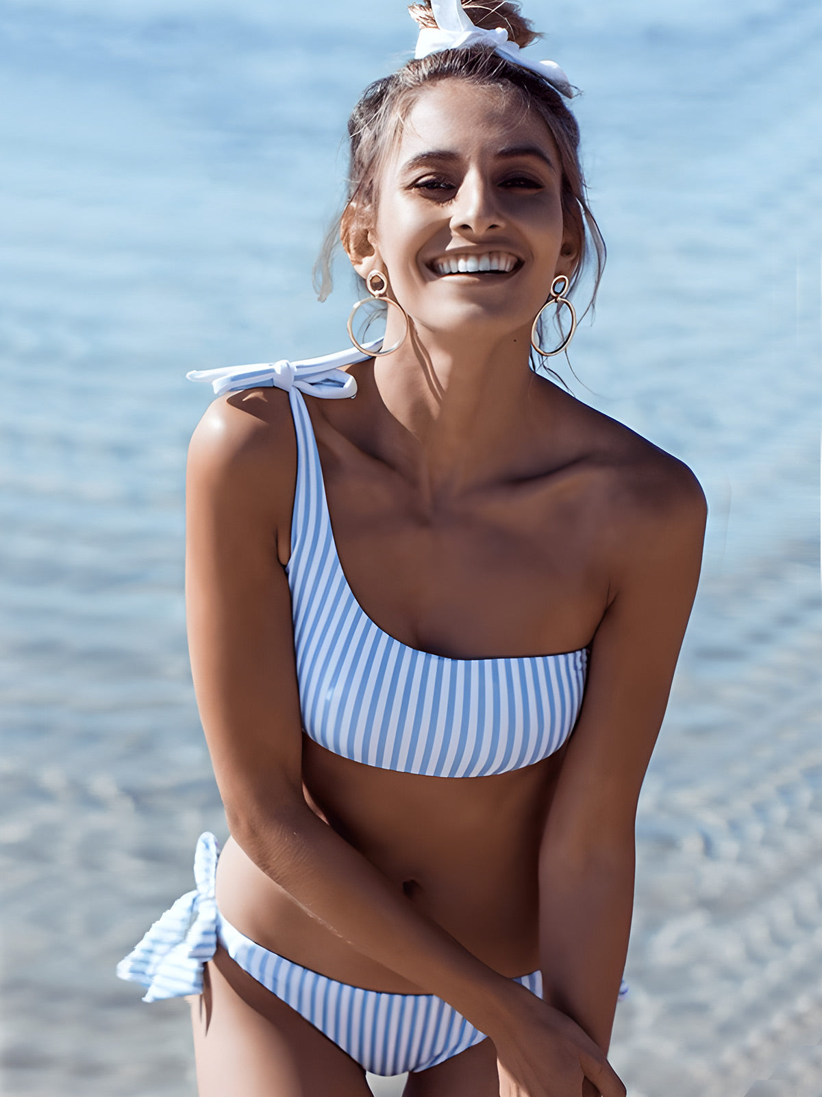 This two-piece swimsuit features a stylish one-shoulder design with a sexy bow accent and bold stripes that enhance your beach look. The lacing-up bandage detail provides adjustable support and a flattering fit, while the low-waist bottom offers a modern silhouette. Ideal for summer, this bikini combines fashion and function for confident, comfortable wear at the beach or poolside.