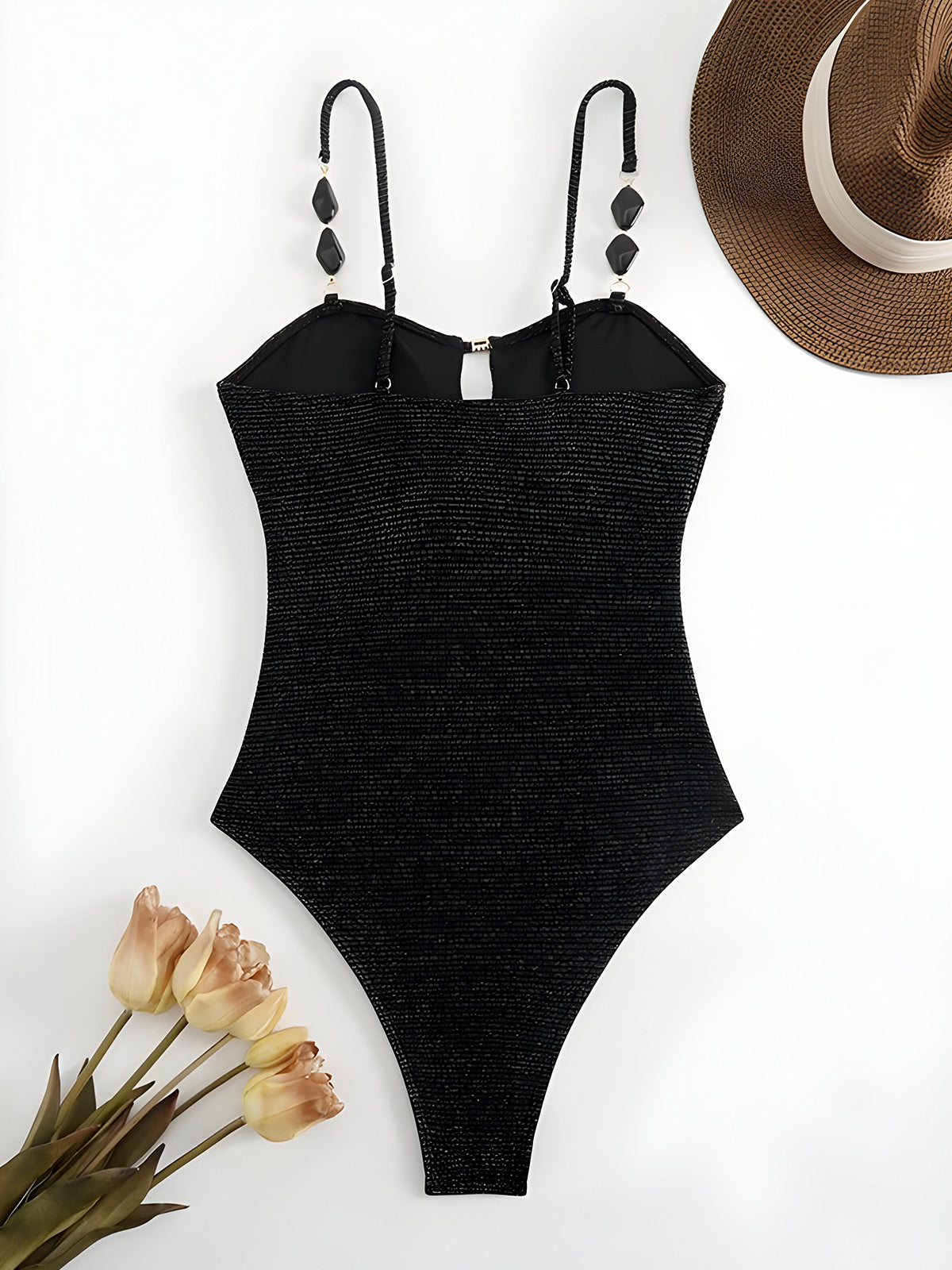 This vintage-inspired black one-piece swimsuit features a metal U-neck design and a slim, backless cut that enhances your silhouette. Crafted with tummy control fabric, it offers a flattering fit and comfortable support. Ideal for beach or poolside, this elegant swimwear combines classic style with functional shaping to boost confidence in and out of the water.