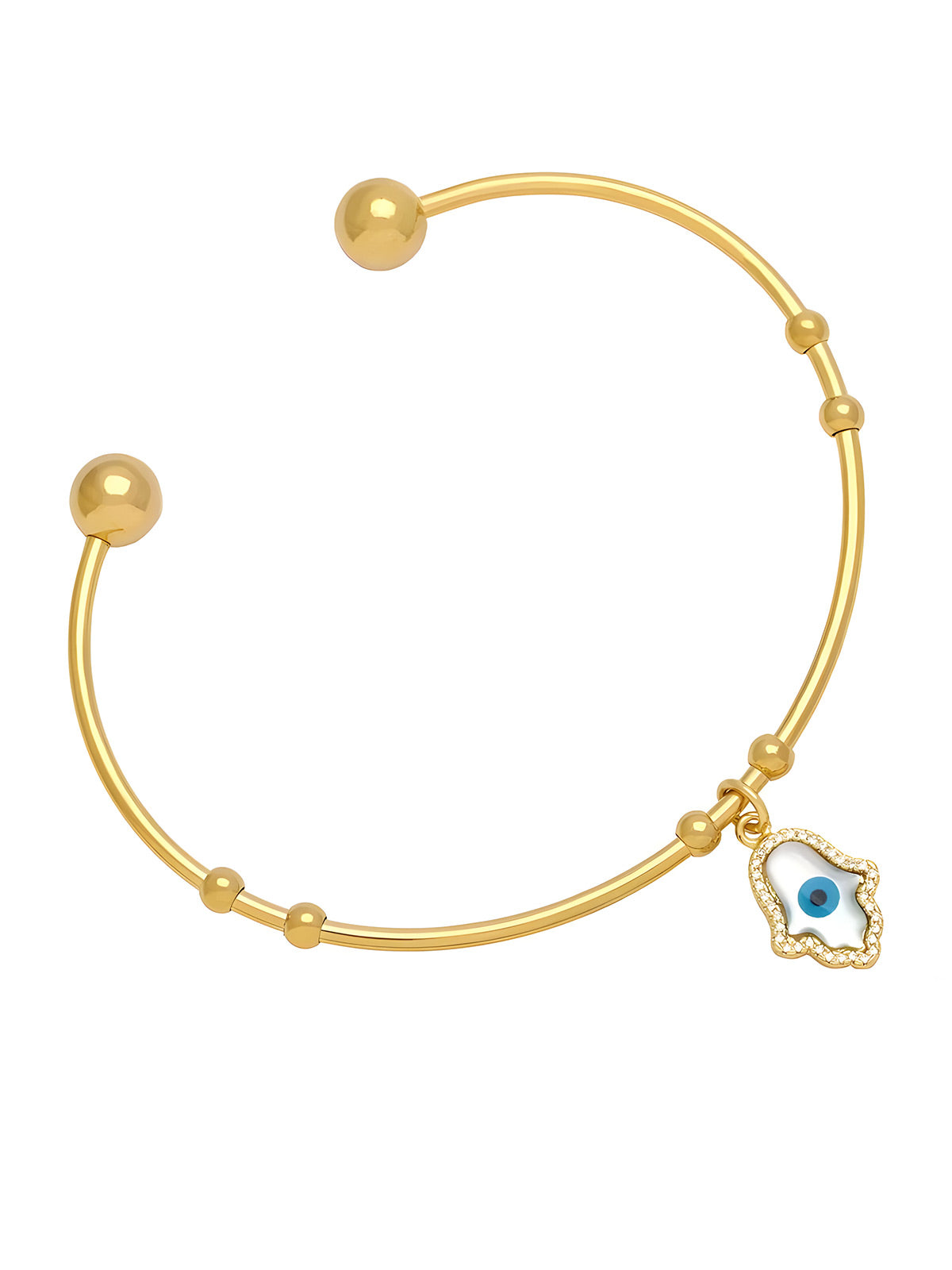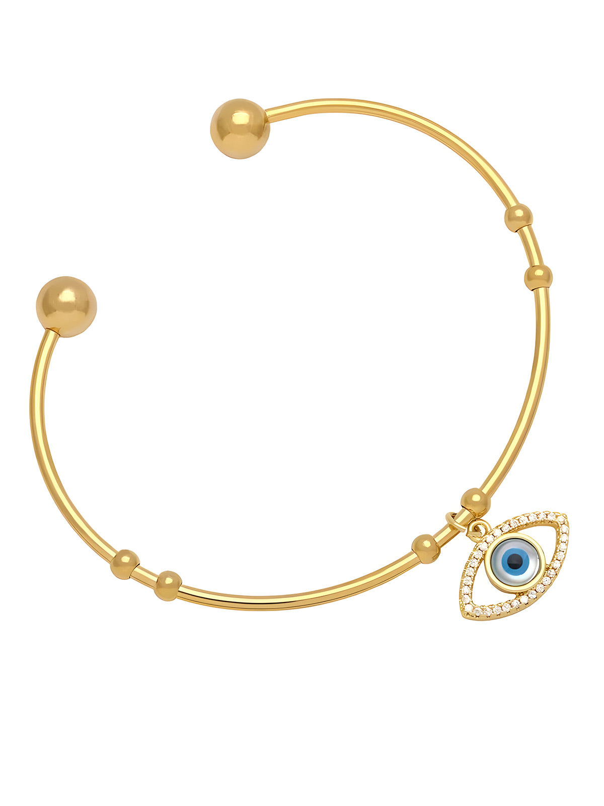 Addilynn is a finely crafted cuff bangle bracelet featuring a unique irregular shape adorned with double gold-plated copper. The design highlights a micro pave setting of cubic zirconia stones forming a lucky eye, heart, and cross motifs, combining symbolic elegance with expert craftsmanship. This piece offers both style and meaningful detail, making it a distinguished accessory for refined tastes.